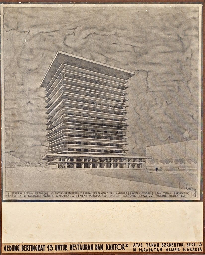 | DESKRIPSI | Kalkir (Calque). Pada usulan terakhirnya, F. Silaban menawarkan bentuk yang lebih kompleks. Landasannya terdiri dari dua buah lingkaran yang masing-masing dikurung oleh dua belas tiang. Letak titik-titik tiang itu dibagi sama rata menggunakan sumbu imajiner yang ditarik dari pusat lingkaran ke garis terluar lingkaran. Pada ketinggian empat meter di tiap tiang lingkaran bagian luar, terdapat patung manusia dengan gerak tubuh yang berbeda-beda. Sedangkan pada lingkaran yang dalam, dua belas tiang pipih menopang satu lingkaran kecil pada ketinggian 24 meter di atasnya, menjadi landasan untuk dua buah patung utama dengan gestur melambaikan tangan seperti pada rancangannya yang lain. |